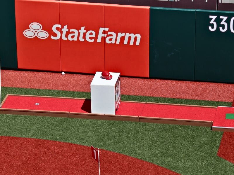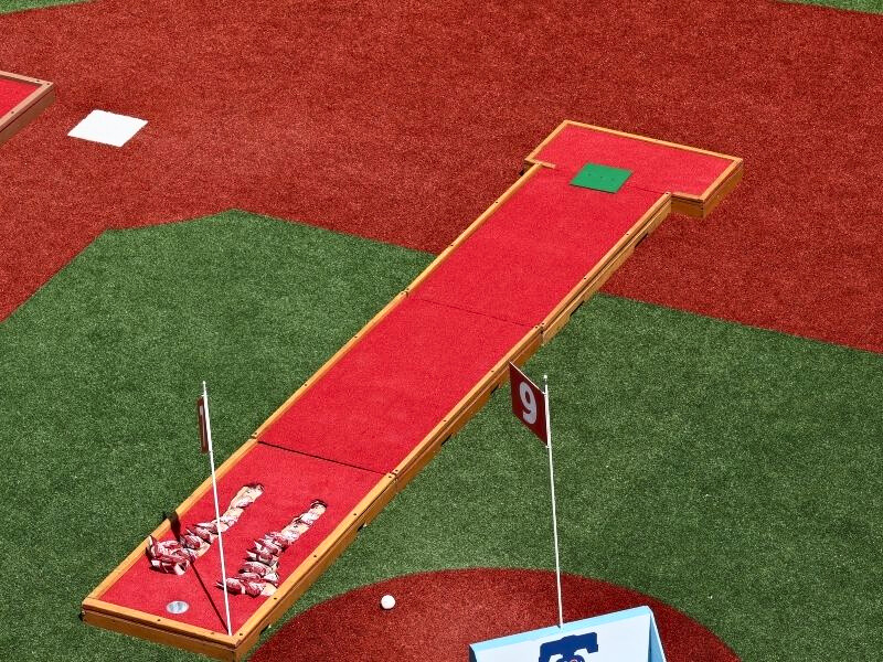 We were once again blessed with a beautiful sunny summer day in late July where our 9 hole course would be installed at the Citizens Phan Field of Citizens Bank Park. Citizens Phan is the wiffle ball field and is the perfect size for creating a custom course. Continuing from earlier in the month with now providing custom colors of turf besides that of green, 6 of the holes for this event were red and the other 3 holes were the traditional green. Holes 1, 5 & 9 were the green holes and these holes each had a Phillies turf logo near the tee area. To start the course, hole 1 was a challenging par 3 with two legs and a branded obstacle that was dangling Herr's potato chip bags to putt through in the first part of the fairways. Hole 5 we labeled the Phillie Phanatic as that was the hole in 2024, where the Phillie Phanatic miraculously was able to get a hole in 1. The last hole of the course was the Skeeball hole which had a branded Skeeball marquee to collect the last shots of the golfers.