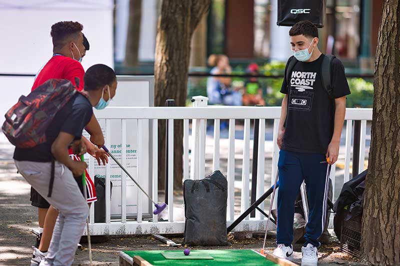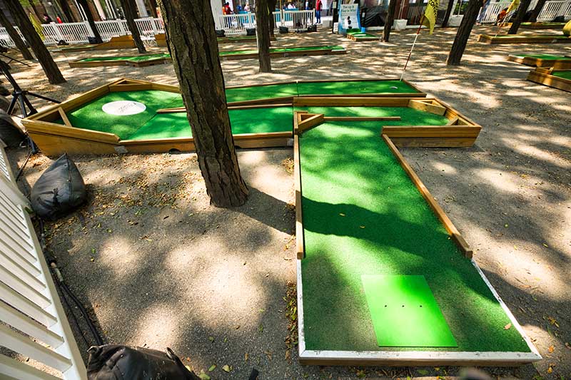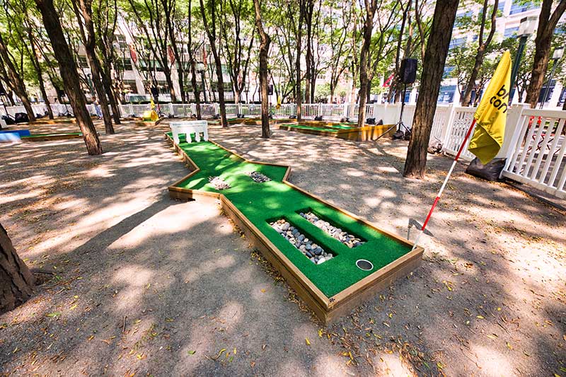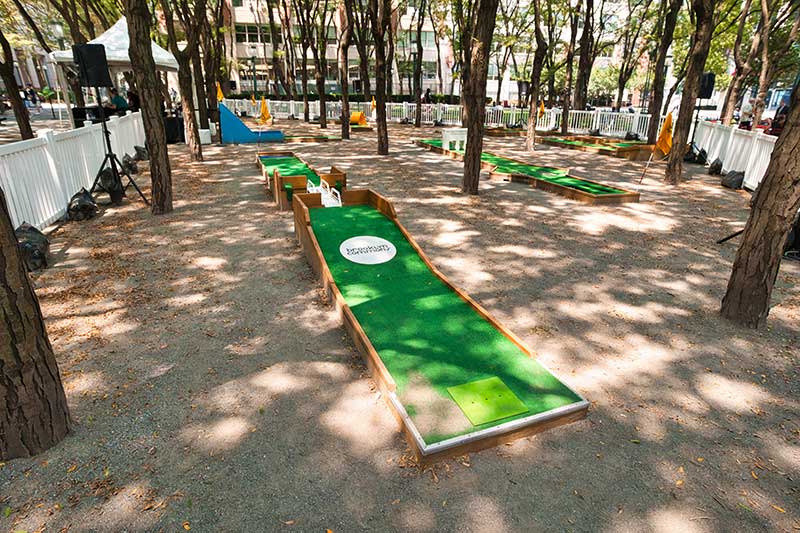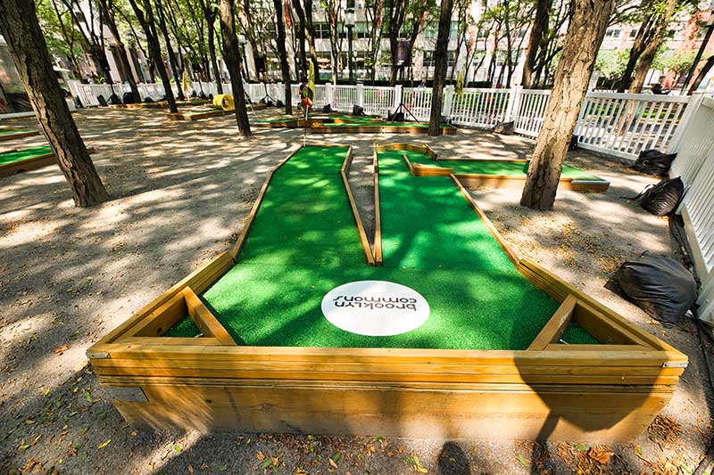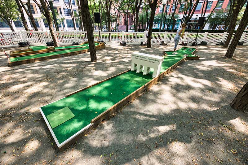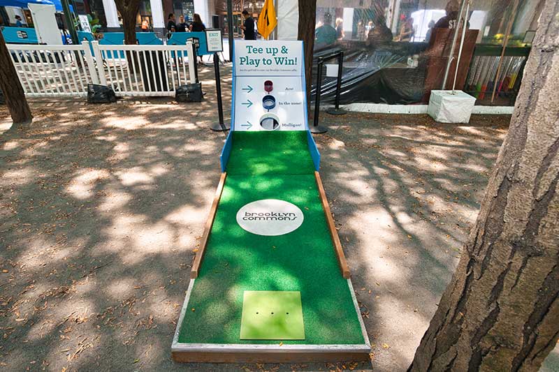 With the success of the long term mini golf installation at Brookfield Place, we were asked to create a 7 hole mini golf rental at Brookfield Properties location in Brooklyn, New York. Previously known as Metrotech, this 16 acre location is comprised of 12 office buildings centered around a common park/plaza area. Since its creation in the 1980's, the common park & outdoor plaza area has become a popular pass through area not just for the individuals working in the 12 office buildings but also for the residents in the nearby growing neighborhood.