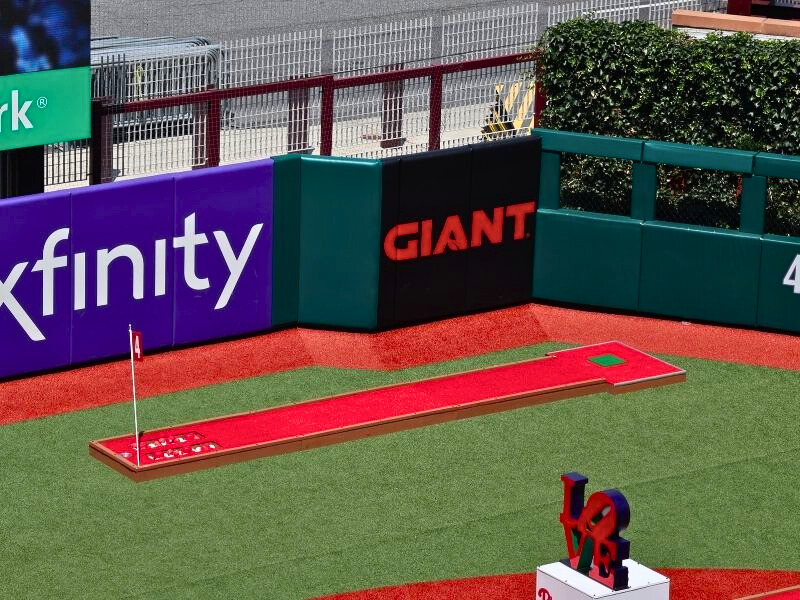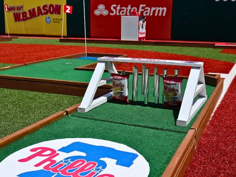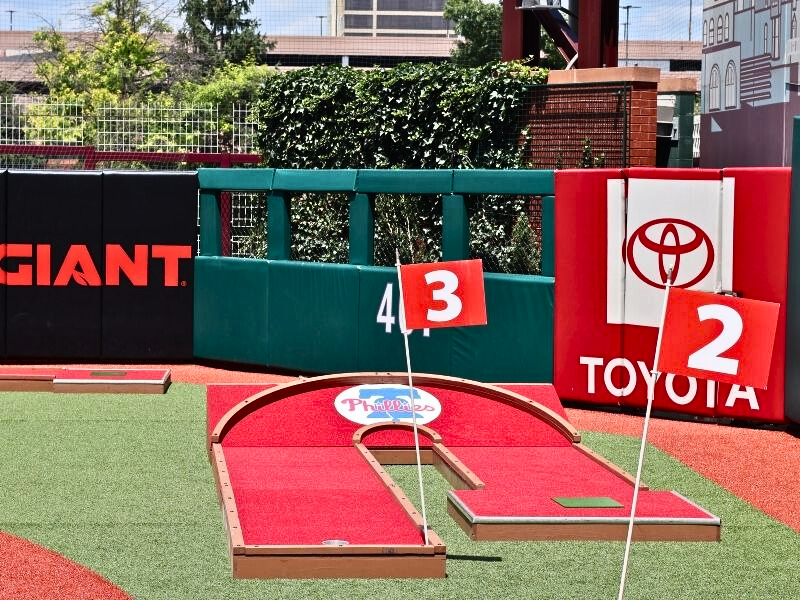 We were once again blessed with a beautiful sunny summer day in late July where our 9 hole course would be installed at the Citizens Phan Field of Citizens Bank Park. Citizens Phan is the wiffle ball field and is the perfect size for creating a custom course. Continuing from earlier in the month with now providing custom colors of turf besides that of green, 6 of the holes for this event were red and the other 3 holes were the traditional green. Holes 1, 5 & 9 were the green holes and these holes each had a Phillies turf logo near the tee area. To start the course, hole 1 was a challenging par 3 with two legs and a branded obstacle that was dangling Herr's potato chip bags to putt through in the first part of the fairways. Hole 5 we labeled the Phillie Phanatic as that was the hole in 2024, where the Phillie Phanatic miraculously was able to get a hole in 1. The last hole of the course was the Skeeball hole which had a branded Skeeball marquee to collect the last shots of the golfers.