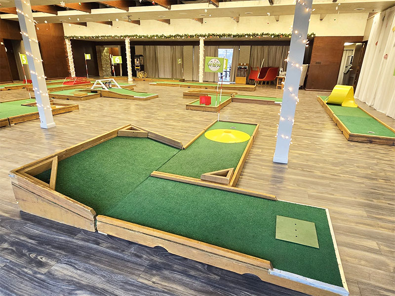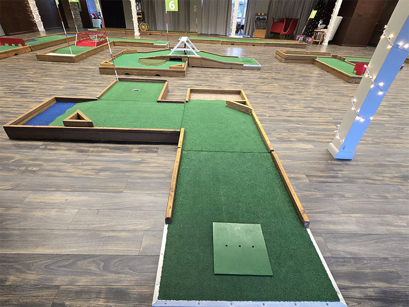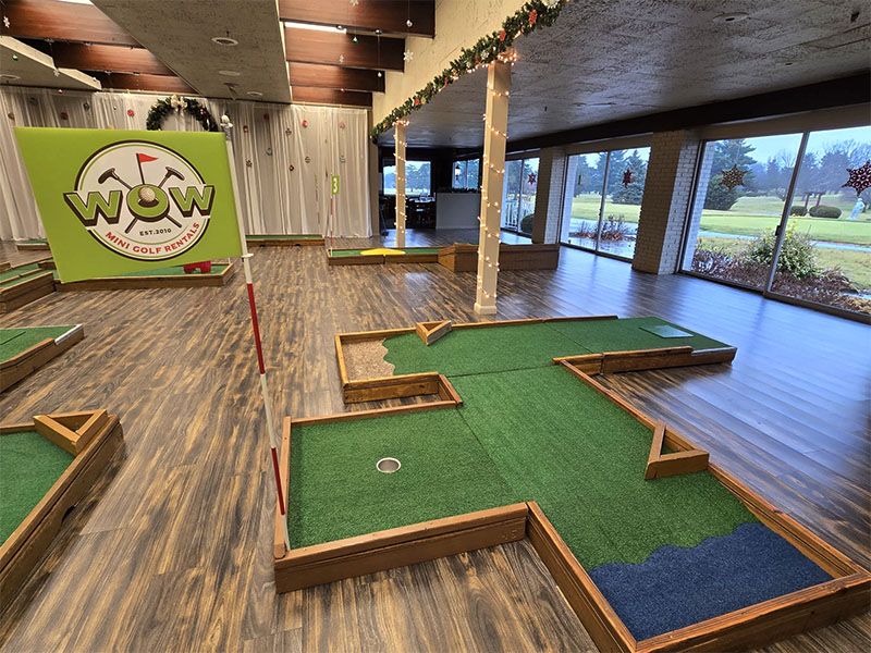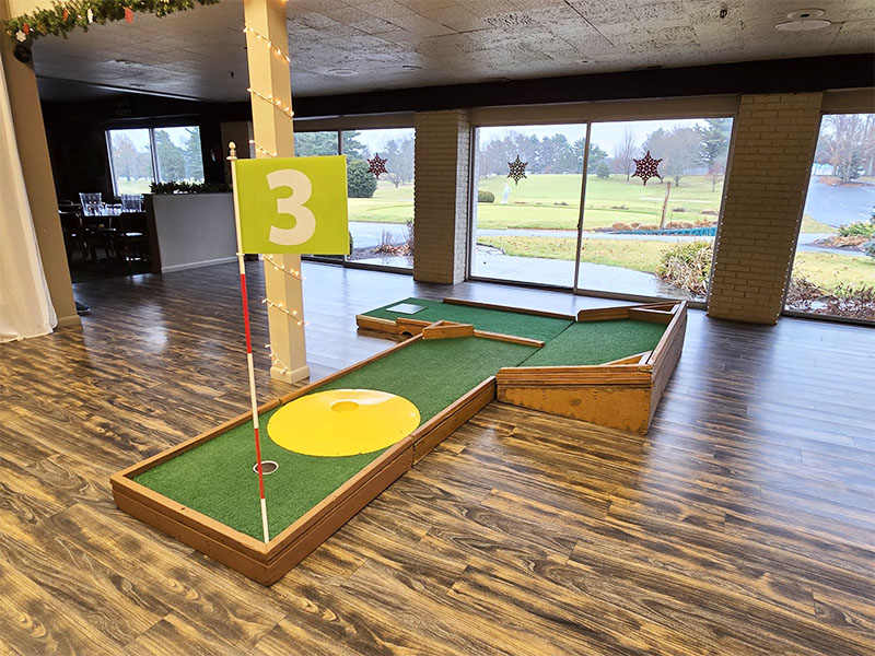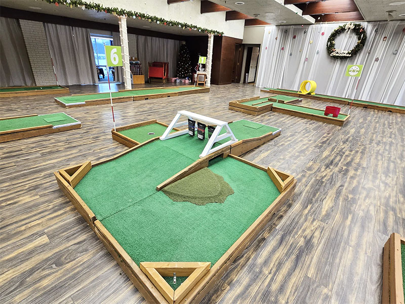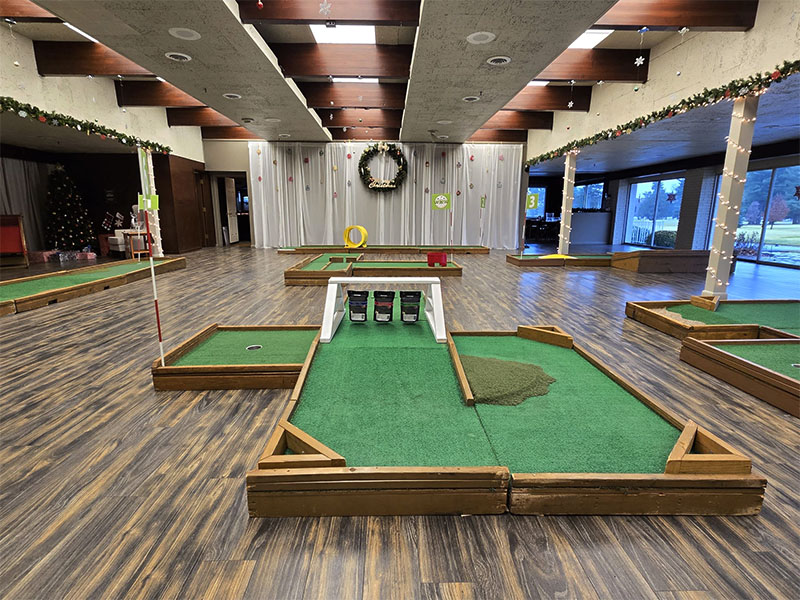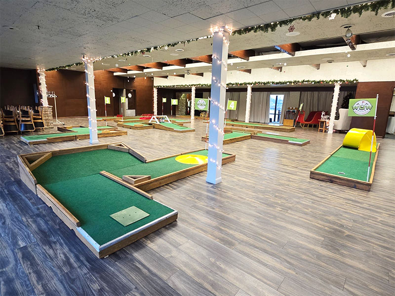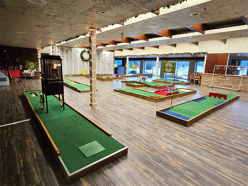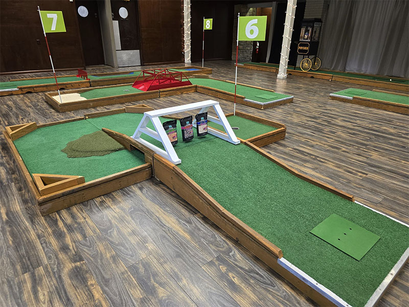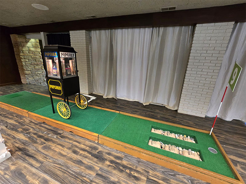 Our last event of the year took us to Monticello, Indiana to provide a custom 9 hole mini golf experience for Wabash Valley Farms for their corporate holiday event. Wabash Valley Farms is a manufacturer of several different types of popcorn as well as gourmet popcorn. Our course designers had that in mind when this course was designed.